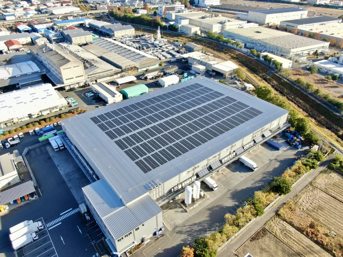 この度、小牧要冷セットセンター様に約800kWの太陽光設備を導入されました。本設備の年間発電量は約960,000kWhを想定しており、年間約407t-CO2の二酸化炭素排出量削減に寄与します。